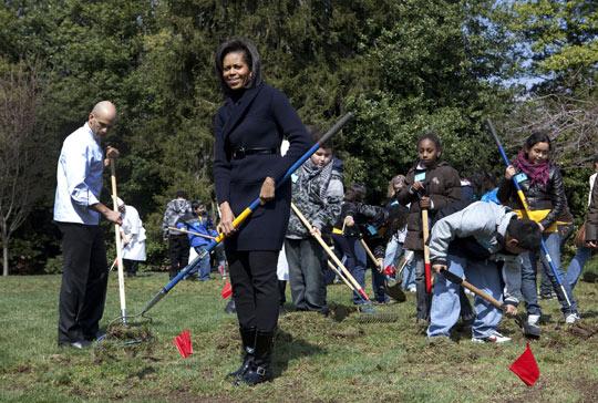 中新網(wǎng)3月21日電 當?shù)貢r間3月20日,美國“第一夫人”米歇爾·奧巴馬帶領一群小學生在白宮的南草坪進行將草地改造菜園計劃。這里種植出的食物將供“第一廚房”和華盛頓其他廚房使用。