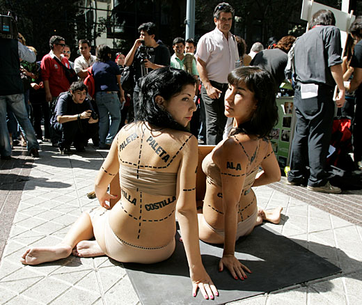 當(dāng)?shù)貢r(shí)間3月19日,來(lái)自AnimaNaturalis動(dòng)物保護(hù)組織的智利美女在首都圣地亞哥舉辦了一場(chǎng)別出心裁的“裸身切割”活動(dòng),呼吁民眾保護(hù)動(dòng)物。
