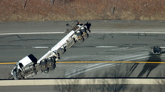 圖:美國一運(yùn)載有害化學(xué)物卡車在公路翻車(2)
