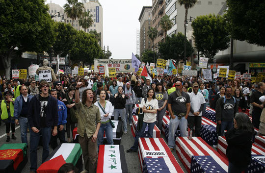 當?shù)貢r間21日,美國數(shù)千名反戰(zhàn)人士聚集在洛杉磯,舉行反戰(zhàn)游行示威活動,紀念伊拉克戰(zhàn)爭爆發(fā)六周年,要求美國政府立即從伊拉克和阿富汗撤軍。
