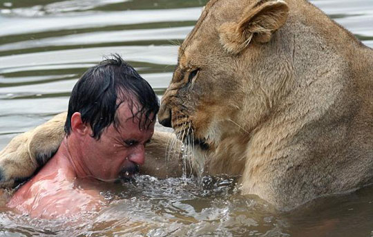 南非動(dòng)物學(xué)家與獅共泳。現(xiàn)年34歲的動(dòng)物學(xué)家凱文經(jīng)常采用不同尋常的方法(一起玩、一起睡覺、一起游泳等等)來(lái)和常人畏懼的動(dòng)物進(jìn)行交流,同時(shí)和動(dòng)物們建立了很好的個(gè)人感情。和他一起游泳的獅子Meg ,體重185公斤,是個(gè)愛好游泳的獅子。