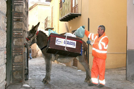 意大利一環(huán)衛(wèi)工帶著驢收垃圾 省錢又環(huán)保。在意大利的卡斯特爾博諾,一名環(huán)衛(wèi)工人帶著驢一起收垃圾。這座西西里島南部的小鎮(zhèn)近日用驢子取代卡車來(lái)運(yùn)輸居民的垃圾。鎮(zhèn)長(zhǎng)馬里奧·西塞羅表示,驢子比卡車更環(huán)保,而且費(fèi)用也更便宜。