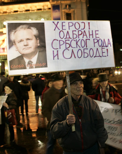 人們高舉前南聯(lián)盟總統(tǒng)米洛舍維奇的畫像。
