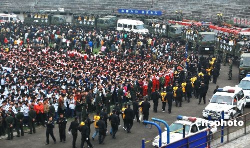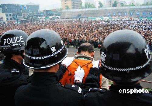 2009年3月26日,湖南省郴州市在東風廣場召開公捕公判大會,對一批犯罪嫌疑人和犯罪分子進行公開刑拘、逮捕和判決,對罪行極其嚴重的犯罪分子判處死刑。 中新社發(fā) 賀茂峰 攝