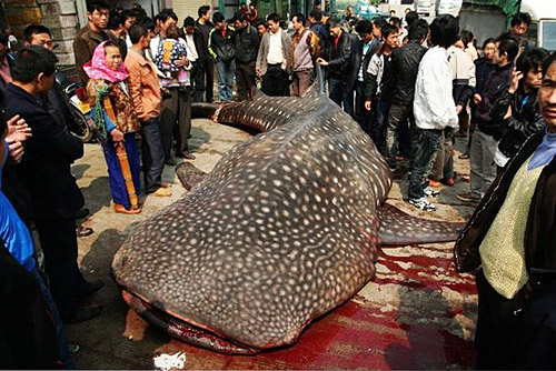在祥芝水產(chǎn)品批發(fā)市場(chǎng)一塊空曠的地面上,記者看到,一條大鯊魚正伏臥在地面上,周邊流淌著不少的血跡,一旁很多漁民正圍觀著,七嘴八舌地相互討論著。這條大鯊魚長(zhǎng)約8米上下,重約2噸以上,頭部寬約2米,嘴巴直徑約為1米,形似青蛙嘴,全身呈灰黑色,身上和鰭上有排列規(guī)則的小白點(diǎn),類似一塊塊小豆腐,用手觸摸鯊魚表皮,感覺十分粗糙。