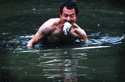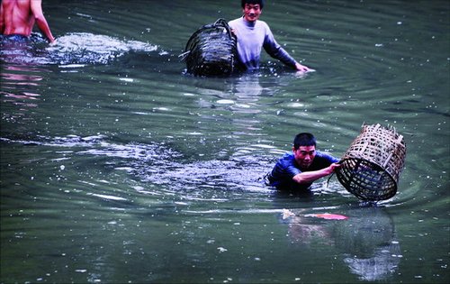 渾濁的池塘水中,無數(shù)福壽魚浮出水面,嘴巴奮力地一張一合。十來個壯年男子站在水中,有人穿著一身衣服,有人僅著底褲;有人拿著塑料袋、竹筐上陣,有人干脆赤手空拳,瞪大眼睛,在渾水中摸魚。他們的目標(biāo)不是探手可及、幾兩重的福壽魚,而是眾多沉在水底、動輒幾斤甚至上十斤的大魚。水不深,但黑黑的淤泥幾乎沒過摸魚者的臀部,這令他們舉步維艱。(肖海坤)