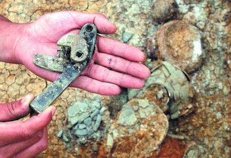記者還在現(xiàn)場看到一個銅質(zhì)弩機(jī)殘件。周科華告訴記者,弩機(jī)是射箭的工具,為戰(zhàn)國晚期器物,可能是目前發(fā)現(xiàn)的最早的銅質(zhì)弩機(jī),考古價(jià)值極大。另外,還有鐵劍、鐵斧、蒜頭壺、陶罐、陶俑等也較有特色。