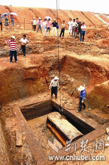 江夏區(qū)博物館館長劉治云告訴記者,經(jīng)過連續(xù)的清理發(fā)掘,7日上午終于打開存放尸體的內(nèi)棺。記者見到,內(nèi)棺里全部充滿黃泥,考古人員小心翼翼用竹片一點點刮出淤泥,里面摻雜著不少黑色的渣滓和絮狀物,只是發(fā)現(xiàn)一塊玉石樣的物體,是墓主的下頜骨還是隨葬品有待考證。