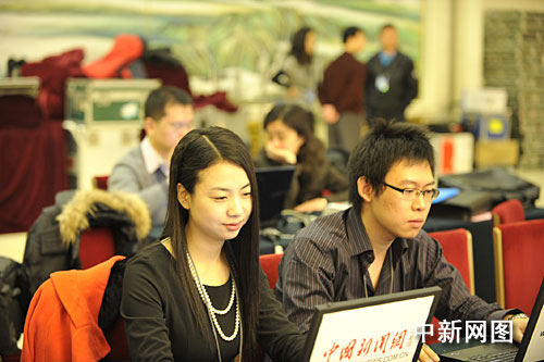 3月14日上午十一屆全國(guó)人大三次會(huì)議閉幕后(預(yù)計(jì)10時(shí)),國(guó)務(wù)院總理溫家寶將在人民大會(huì)堂三樓金色大廳與采訪十一屆全國(guó)人大三次會(huì)議的中外記者見(jiàn)面并回答記者提出的問(wèn)題。圖為中新網(wǎng)工作人員已經(jīng)在金色大廳就位,做好直播前的準(zhǔn)備。中新網(wǎng)發(fā) 吳歆 攝