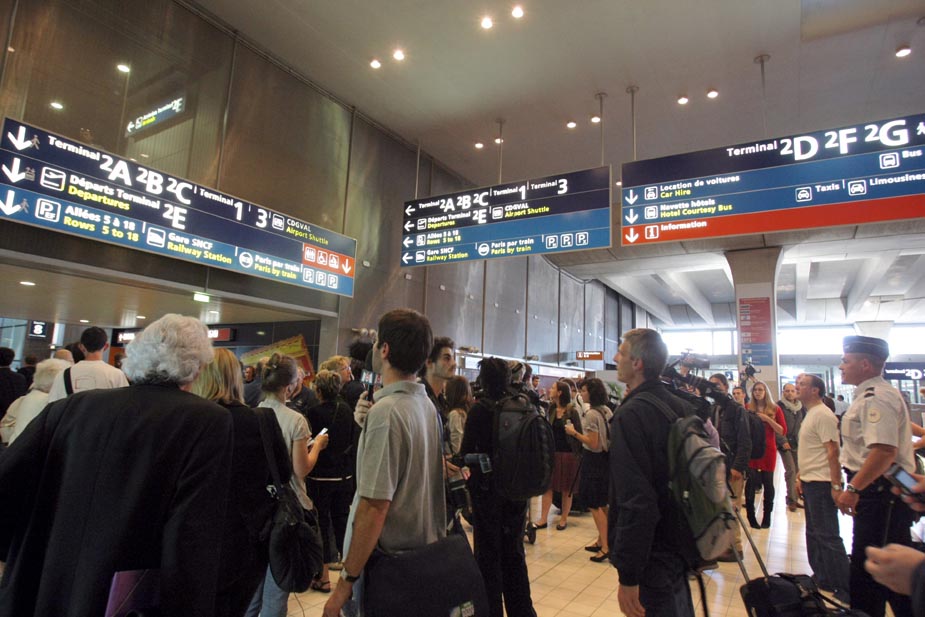 在法國(guó)戴高樂(lè)機(jī)場(chǎng),接機(jī)者焦急等待該航班抵達(dá)。