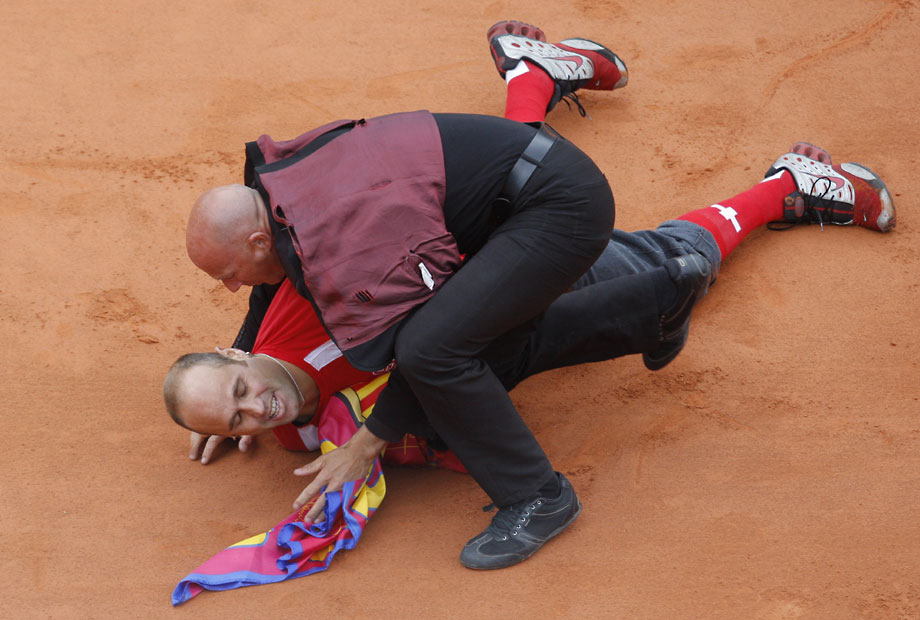 法網(wǎng)男單決賽場上,一位費(fèi)天王的癡心球迷沖入球場,強(qiáng)行將自制的一頂帽子戴到費(fèi)德勒的頭上。安保人員及時(shí)出現(xiàn),將狂熱粉絲架出場外。