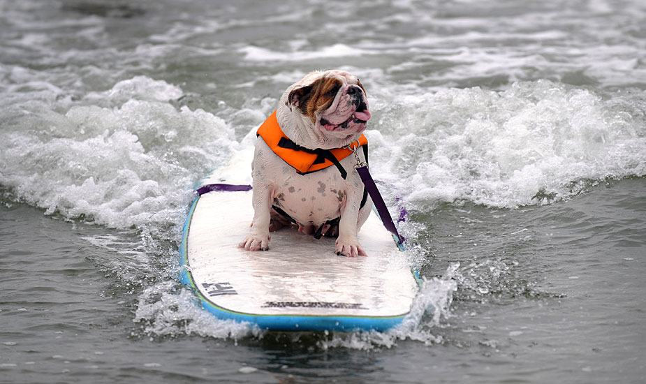 6月20日,在美國加利福尼亞州帝國沙灘舉行了一場小狗沖浪比賽,小狗們表現(xiàn)得十分認(rèn)真。