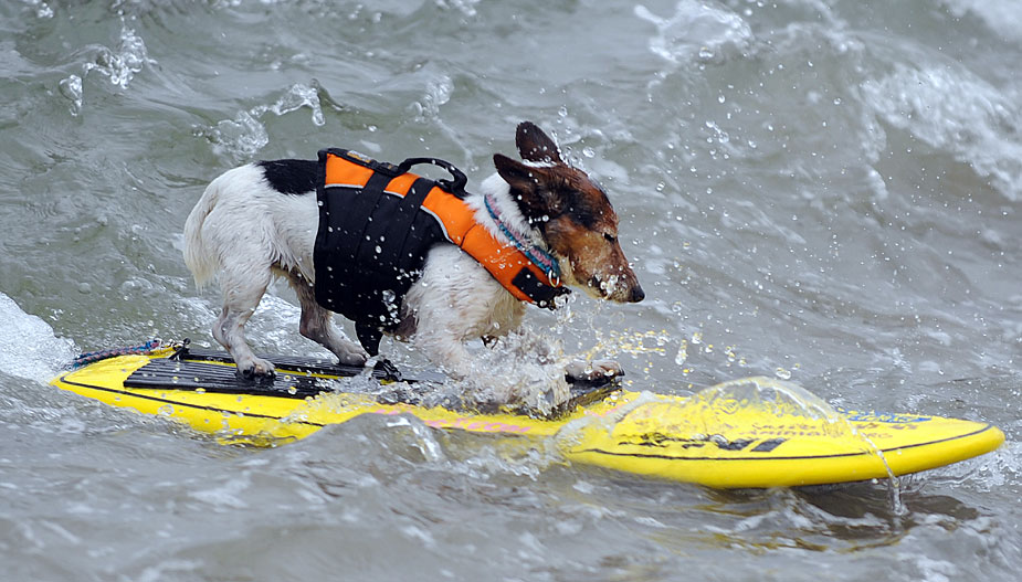 6月20日,在美國加利福尼亞州帝國沙灘舉行了一場(chǎng)小狗沖浪比賽,小狗們表現(xiàn)得十分認(rèn)真。