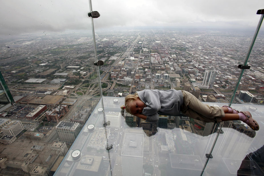 7月1日,美國(guó)芝加哥,西爾斯大廈在第103層瞭望臺(tái)增設(shè)的玻璃陽(yáng)臺(tái)對(duì)媒體開(kāi)放。這些玻璃陽(yáng)臺(tái)建在大廈西側(cè),從瞭望臺(tái)向外延伸約1.2米。陽(yáng)臺(tái)的玻璃地板厚達(dá)12.7厘米,可承重約5噸。