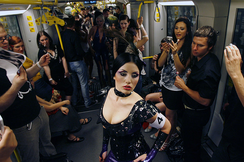 7月2日,模特在德國首都柏林的一輛地鐵上,演繹名為“地鐵上的貓步”時(shí)裝秀。