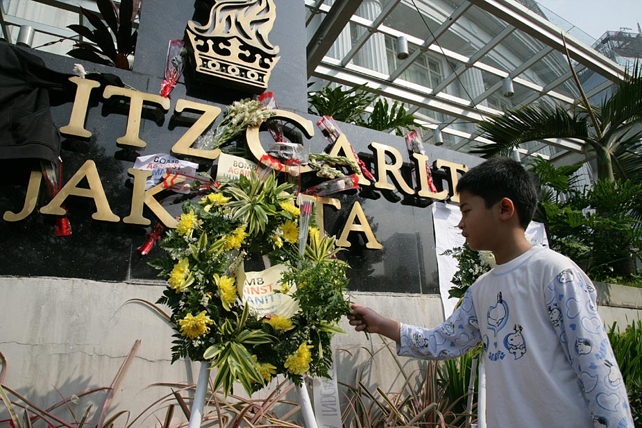 7月18日,印度尼西亞首都雅加達(dá)的民眾紛紛來到發(fā)生爆炸的萬豪酒店和麗嘉酒店,向死難者獻(xiàn)花表示哀悼。