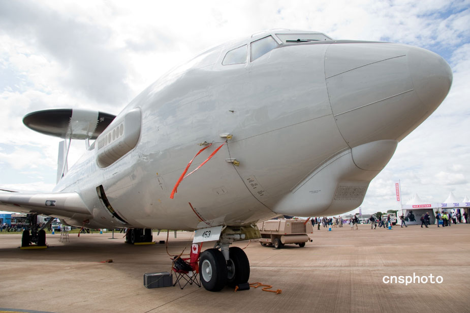 2009年7月,“2009英國(guó)費(fèi)爾福德航展”在英格蘭費(fèi)爾福德開展。圖為北約駐盧森堡的E-3A預(yù)警機(jī)在此次航展上亮相。中新社發(fā) 潘禹 攝