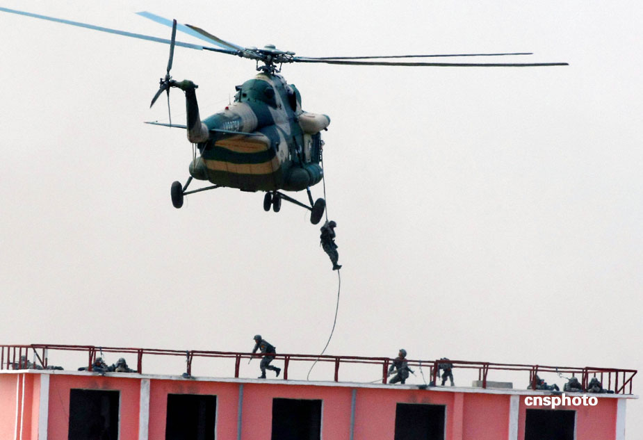 中國、俄羅斯兩軍總參謀長,7月23日上午到沈陽軍區(qū)洮南合同戰(zhàn)術訓練基地,觀看“和平使命2009”聯(lián)合反恐軍事演習。雙方以陸軍和空軍為主,中方參演部隊包括1個陸軍戰(zhàn)斗群和1個空軍戰(zhàn)斗群。俄方參演兵力包括1個陸軍加強摩步營、1個空降突擊連和部分空軍兵力,雙方投入兵力兩千多人。中新社發(fā) 宋吉河 攝