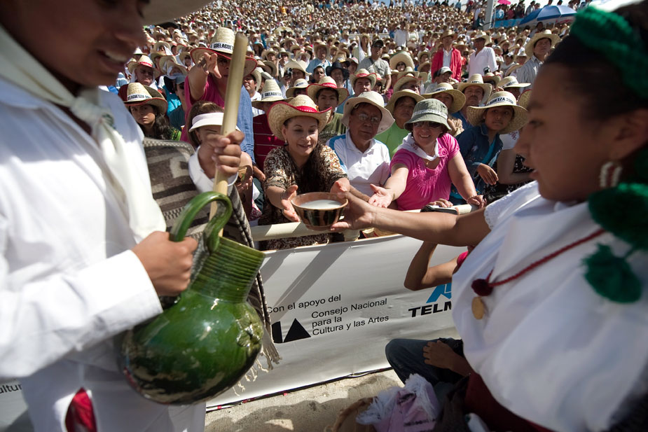 每年7月的最后兩個(gè)星期一是瓦哈卡聞名世界的“蓋拉蓋查節(jié)(Guelaguetza)”,來(lái)自瓦哈卡州各地、各具特色的印第安部落推選出具有代表性的舞蹈隊(duì),在瓦哈卡城外的弗爾丁山上載歌載舞,同時(shí)也為前來(lái)觀看的世界各地游客獻(xiàn)上本部落的土特產(chǎn)。