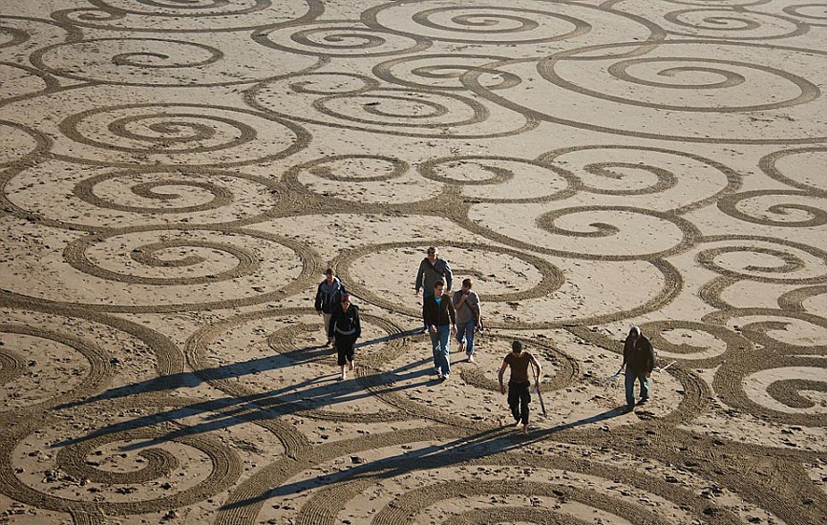 據(jù)英國媒體7月27日報道,藝術(shù)家Andres Amador用耙子在沙灘上作畫,眾多中心對稱的幾何圖形,不在乎是否能長久保留,但求被海浪帶走前與大自然的完美融合。