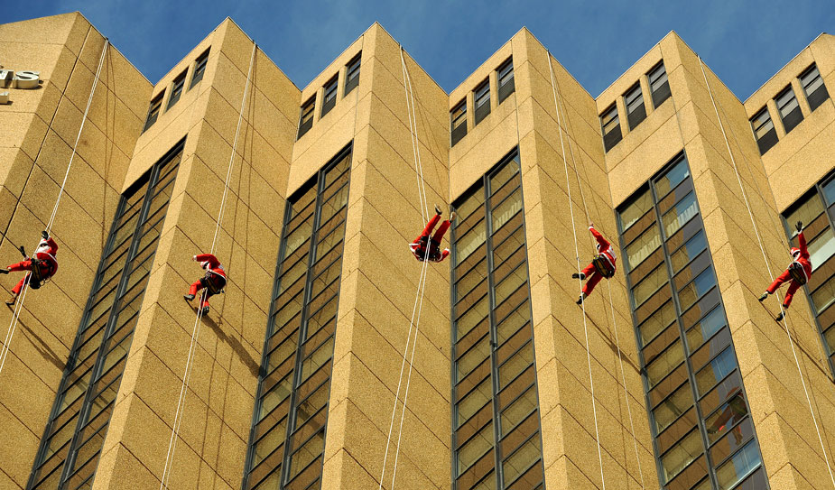 8月5日,澳大利亞5名男子身著圣誕老人服飾從悉尼歌劇院旁一高層酒店樓頂“從天而降”。