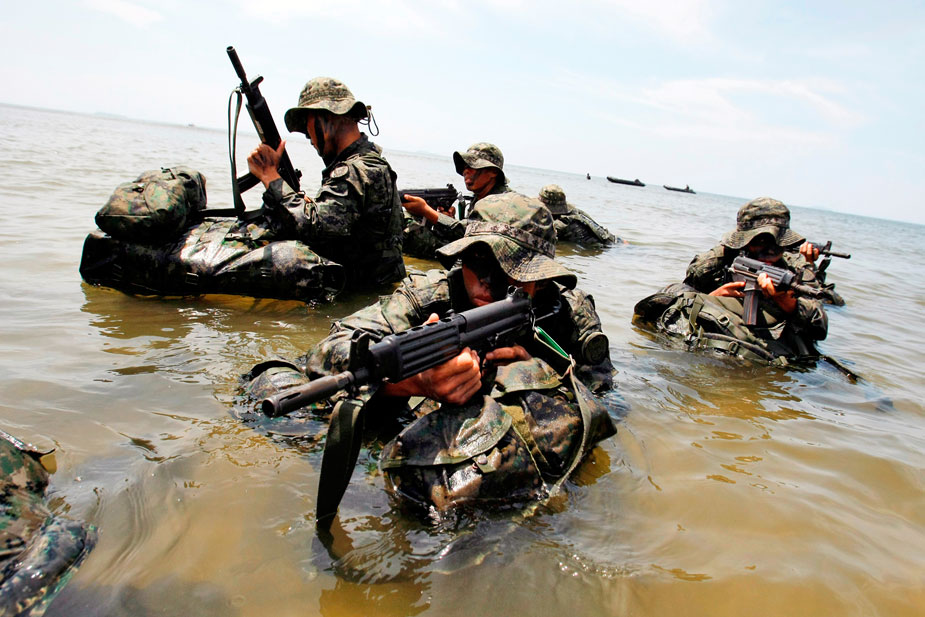 2009年8月5日,韓國(guó)特種戰(zhàn)司令部特種作戰(zhàn)分隊(duì)在南泰安郡演練海上滲透攻擊。