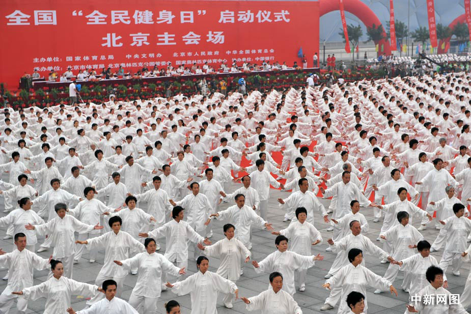 8月8日,全國首個(gè)“全民健身日”北京主會場啟動儀式上,三萬多群眾進(jìn)行太極拳展示活動,在世界吉尼斯總部認(rèn)證官員的見證下成功打破世界紀(jì)錄。中新網(wǎng)記者 金碩 攝