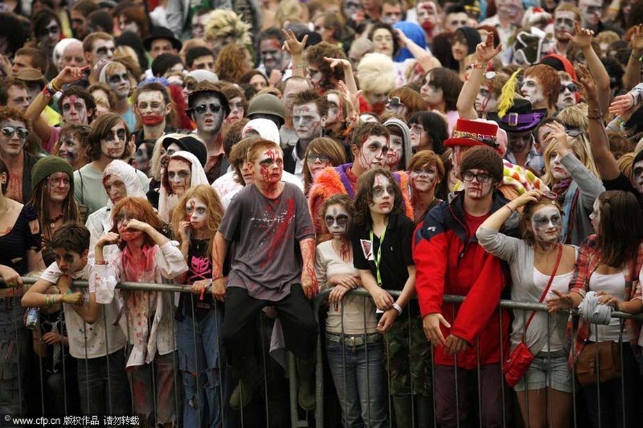 2009年8月6日,英國赫里福德郡Eastnor城堡,人們化裝成“僵尸”出現(xiàn)在大寒音樂節(jié)上,欲打破同一地點聚集最多“僵尸”的世界紀(jì)錄。
