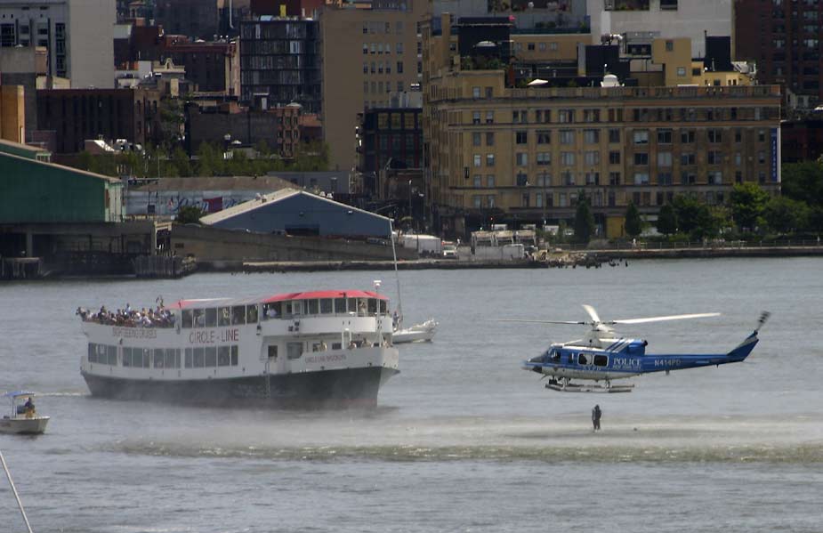 8月8日,紐約市曼哈頓西側(cè)的哈德遜河上空,一架觀光直升飛機(jī)和一架小型飛機(jī)相撞,兩飛機(jī)雙雙墜入河中。據(jù)稱觀光直升飛機(jī)上載有五名意大利游客和一名飛行員,而小型飛機(jī)上則有三人。圖為救援直升機(jī)在現(xiàn)場(chǎng)搜救。