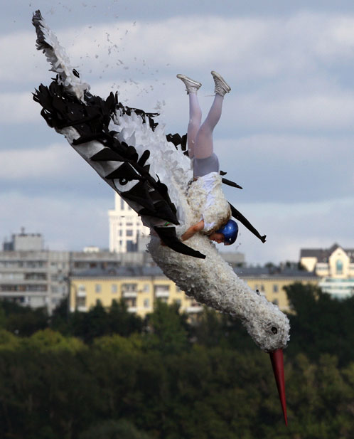 8月9日,莫斯科河畔舉辦一年一度的“墜落節(jié)”,表演者帶著自己設(shè)計制作的各種“飛行器”勇敢的從高空跳入水中。