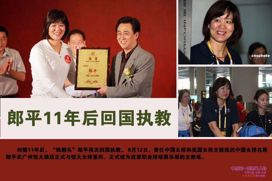 中新網本周熱點人物之郎平——曾任中國女排和美國女排主教練的中國女排名將郎平8月12日在廣州恒大酒店正式與恒大女排簽約,正式成為這家職業(yè)排球俱樂部的主教練。這標志著時隔11年,郎平再次回國執(zhí)教。