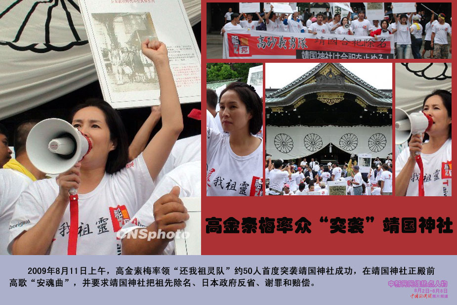 中新網(wǎng)本周熱點(diǎn)人物之高金素梅——高金素梅一行于上午9時(shí)30分左右搭車出其不意地抵達(dá)靖國神社,隨即高舉“要求靖國還我祖靈”等大型橫布條標(biāo)語,浩浩蕩蕩地列隊(duì)走向靖國神社的正殿,并高喊口號(hào)。靖國神社的警衛(wèi)人員前往阻擋,企圖奪走標(biāo)語布條,雙方發(fā)生肢體沖突。