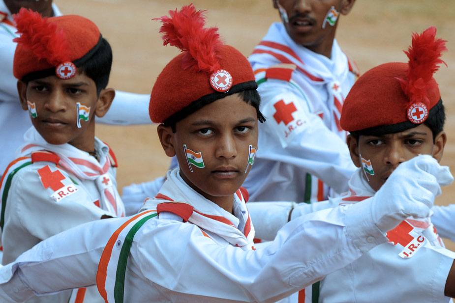 慶祝獨立62周年閱兵式上的印度童軍在做隊列表演。