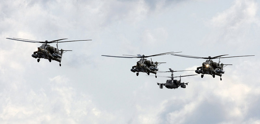 圖為武裝直升飛機進行飛行表演。