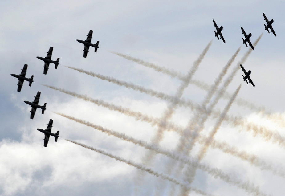 圖為意大利空軍“三色箭”飛行隊(duì)精彩的特技飛行表演。