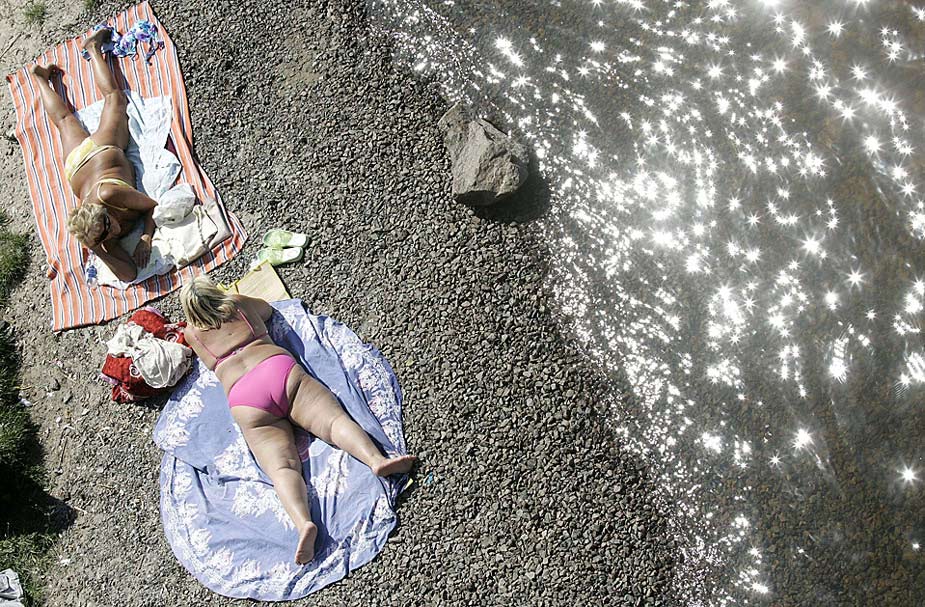 游人們?cè)跒蹩颂m基輔的沙灘上曬日光浴。