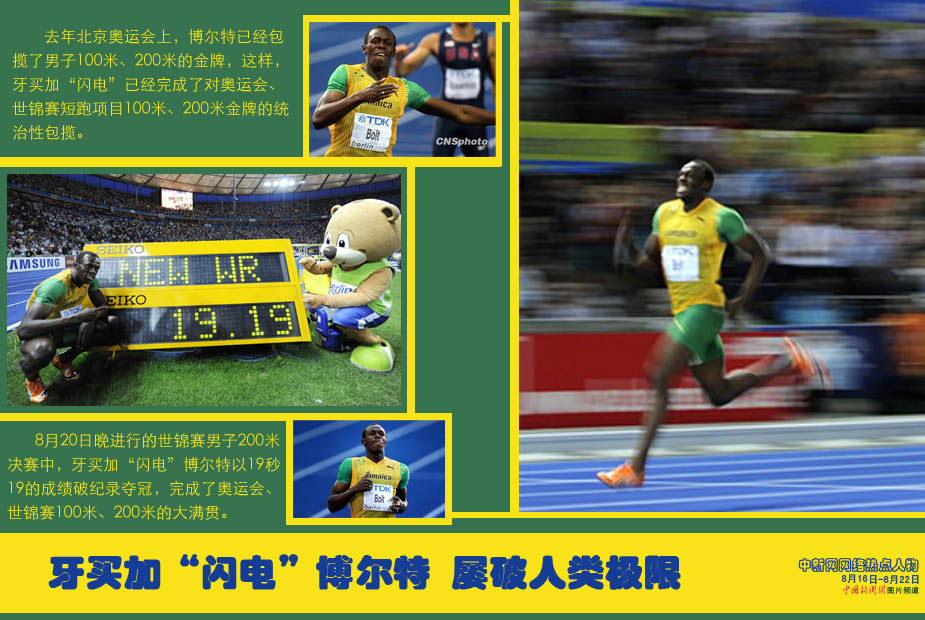 中新網(wǎng)本周熱點(diǎn)人物之——博爾特 第12屆國際田徑聯(lián)合會世界田徑錦標(biāo)賽男子200米決賽在柏林奧林匹克體育場舉行,已經(jīng)獲得100米冠軍并打破世界紀(jì)錄的牙買加超級名星博爾特以19.19秒的成績獲得冠軍并打破世界紀(jì)錄。