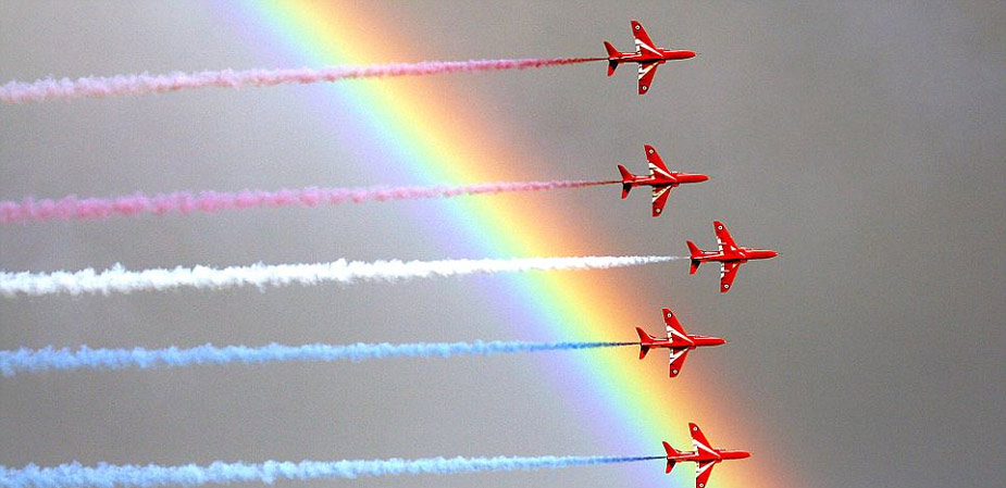 據(jù)英國媒體近日?qǐng)?bào)道,英國皇家空軍“紅箭”飛行表演隊(duì)20日在英國康沃爾郡福伊港進(jìn)行飛行特技表演時(shí),恰巧天邊出現(xiàn)一道彩虹,相映成輝,異常漂亮。