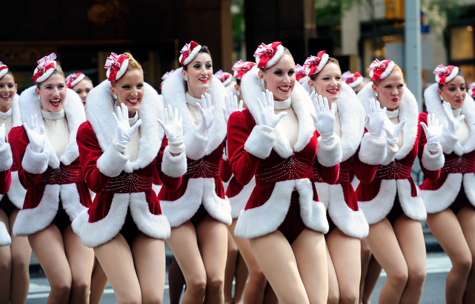 8月25日,美國“火箭女郎”舞蹈團身著圣誕裝在無線電城音樂廳(Radio City Music Hall)前演出。來源:中國新聞網(wǎng)