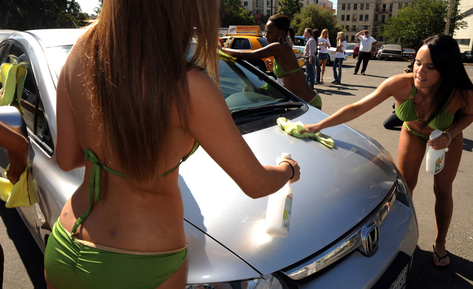 8月25日,一群身著綠色比基尼的模特在好萊塢前,為過往的混合動力環(huán)保車主免費擦車,呼吁環(huán)境保護。來源:中國新聞網(wǎng)