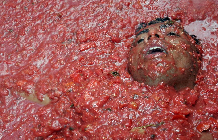 8月26日,西班牙東南部小鎮(zhèn)Bunol當(dāng)日迎來傳統(tǒng)的西紅柿節(jié)。大約4萬名狂歡者在1小時內(nèi)扔掉了11萬公斤西紅柿。來源:中國新聞網(wǎng)