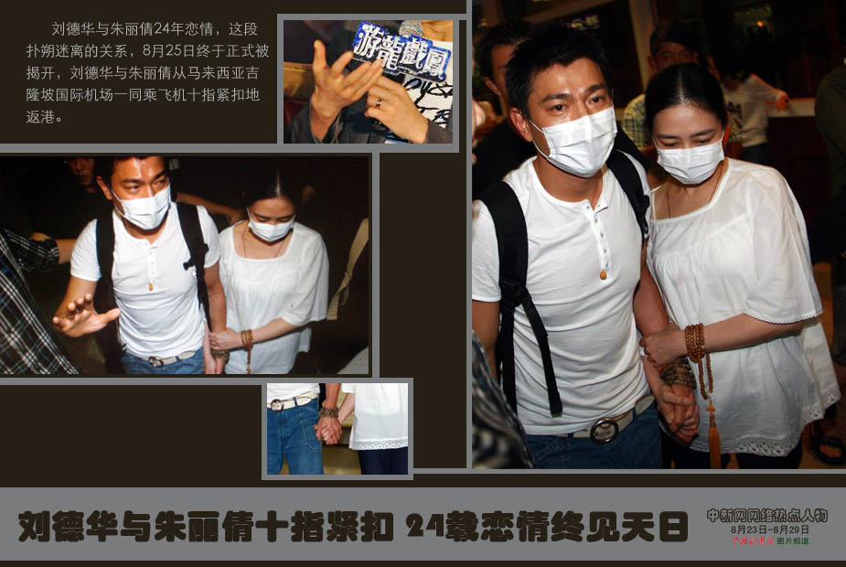 中新網(wǎng)本周熱點人物之——劉德華與朱麗倩 劉德華與朱麗倩24年戀情,這段撲朔迷離的關(guān)系,8月25日終于正式被揭開,兩人繼日前結(jié)伴到岳父墓前拜祭后,劉德華與朱麗倩從馬來西亞吉隆坡國際機場一同乘飛機十指緊扣地返港。