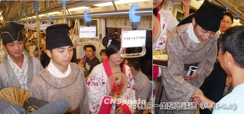 三日上午,三位身著古裝的年輕人在南京地鐵首列品牌列車“人文號”里,與乘客一起朗誦詩歌、知識競答。圖片來源:中國新聞網(wǎng)