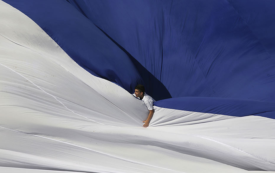 9月17日,在耶路撒冷的一個體育場內(nèi),一名以色列男孩在一幅巨大的、鋪展開的旗子上玩耍。它被吉尼斯世界紀錄評為世界上最大的旗子。圖片來源:中國新聞網(wǎng)