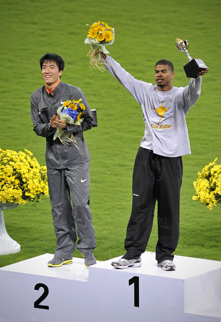 圖為領(lǐng)獎(jiǎng)臺(tái)的翔飛人。在20日晚進(jìn)行的上海田徑大獎(jiǎng)賽的男子110米欄的比賽中,劉翔時(shí)隔13個(gè)月后重返賽場(chǎng),并跑出13秒15的成績(jī)。美國(guó)名將特拉梅爾以13秒15的同樣成績(jī)、近乎為零的優(yōu)勢(shì)奪走冠軍。