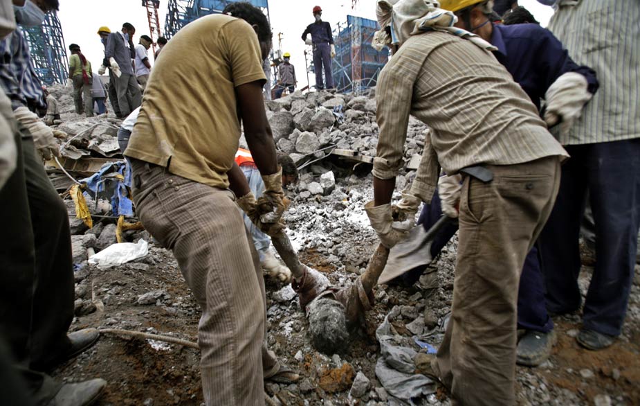 印度中部一座在建電廠的巨型煙囪23日下午發(fā)生倒塌,目前估計(jì)已有至少100人罹難。圖片來源:中國新聞網(wǎng)