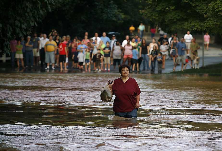 22日,洪水襲擊美國喬治亞洲,一位婦女為了趕去工作,毫不猶豫地趟過被洪水淹沒的街道。圖片來源:中國新聞網(wǎng)