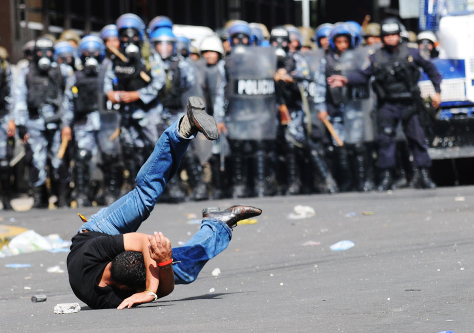 23日,在洪都拉斯首都特古西加爾巴,一名抗議者被警察的橡膠子彈擊中。洪都拉斯警方發(fā)言人奧爾林·塞拉托當(dāng)日表示,自21日被罷免總統(tǒng)塞拉亞突然回國(guó)以來(lái),洪首都特古西加爾巴局部地區(qū)發(fā)生多次騷亂,已經(jīng)造成兩人喪生。圖片來(lái)源:中國(guó)新聞網(wǎng)