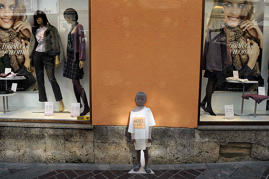 在斯洛文尼亞的盧布爾雅那街頭,聯(lián)合國(guó)兒童基金會(huì)放置了一個(gè)小乞丐的圖片紙板,以引起人們關(guān)注那些身處困境的盧旺達(dá)兒童。圖片來(lái)源:中國(guó)新聞網(wǎng)