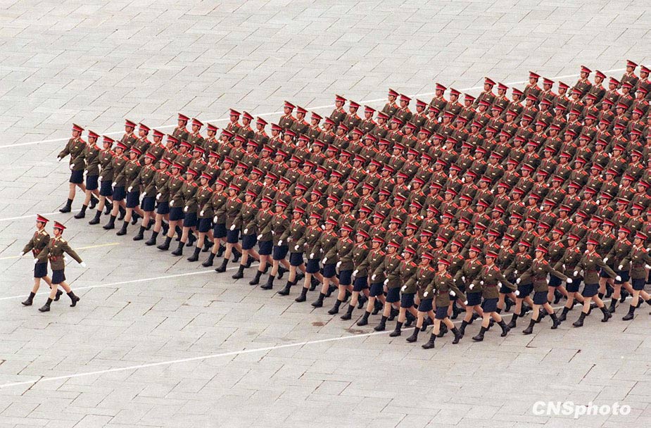 由白求恩軍醫(yī)學(xué)院學(xué)員組成的女兵方隊(duì),邁著整齊的步伐經(jīng)過天安門城樓。該校曾經(jīng)組建中國閱兵史上的第一支女兵方隊(duì)參加國慶三十五周年的首都閱兵慶典。中新社發(fā) 任晨鳴 攝